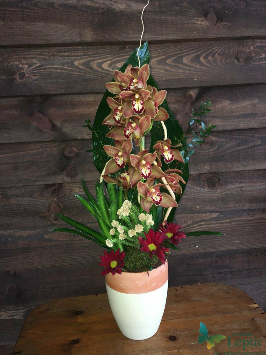 aranžman u keramici grana mini orhideje, salix, eucaliptus, tropical mix, safari mix, aspidistra, mahovina