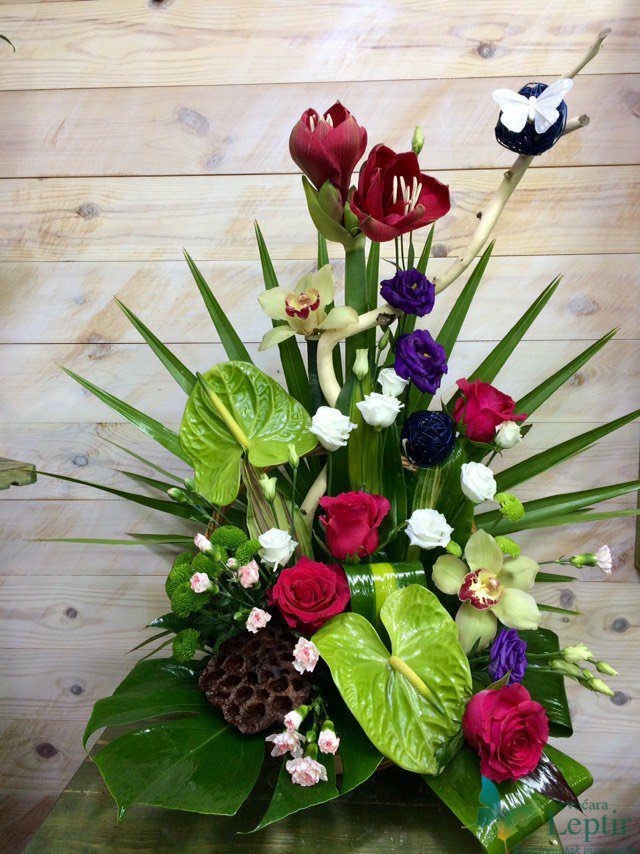 amarilis, anthuriumi, ruže, lizijantusi, karanfil, zelenilo
